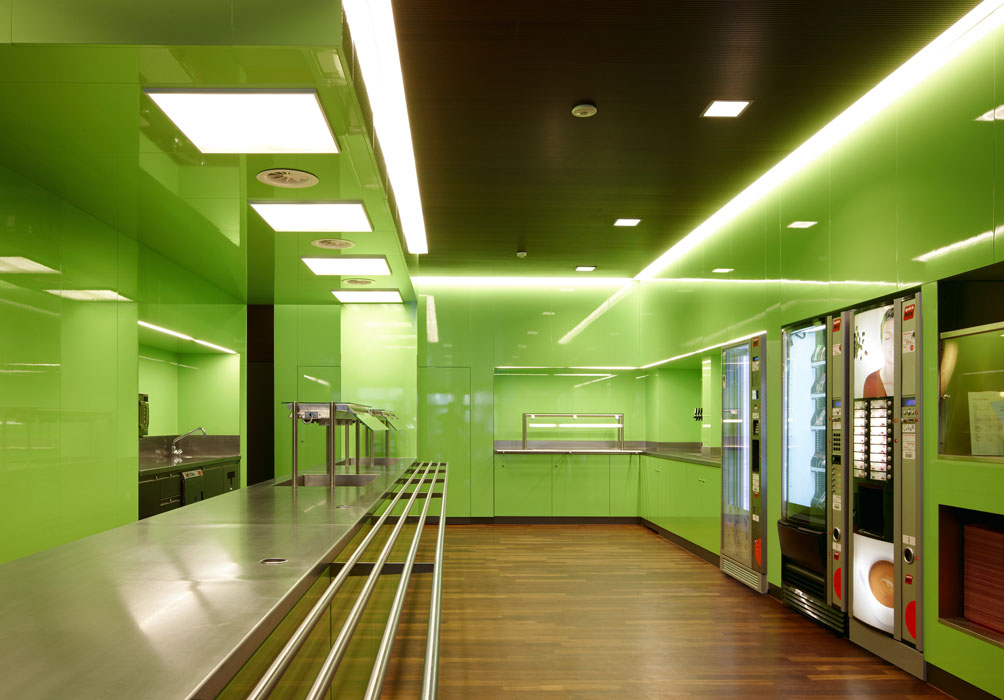 Die Mensa im Freien Gymnasium Zürich wurde erneuert. Neben technischen und betrieblichen Anpassungen an die heutigen Anforderungen stand die räumliche Verbesserung im Vordergrund. Es wurde eine Atmosphäre angestrebt, die zum Verweilen einlädt und die Mensa zu einem beliebten Aufenthaltsort werden lässt. Boden, Brüstungen und Decke sind mit Holz verkleidet. In diesem prägnanten Rahmen stehen zwei Objekte, die in ihrer Wechselbeziehung eine räumliche Spannung aufbauen: Ein Wandbild von Klaus Däniker und die Buffetanlage. Das Wandbild tritt mit seiner Zickzackform als Volumen in Erscheinung. Von jedem Standort im Raum ist es neu erlebbar. Die Buffetanlage ist das volumetrische Gegenstück. Mit ihrer entmaterialisierenden Farbgebung kontrastiert sie den Holzcharakter des Raumes. Eine weitere Parallele zum Wandbild ist die vielseitige Erlebbarkeit der Buffetanlage. Vom Essbereich aus schauend, tritt sie als Volumen in Erscheinung. Beim Menufassen erhalten die farbigen Wände räumliche Qualitäten.
