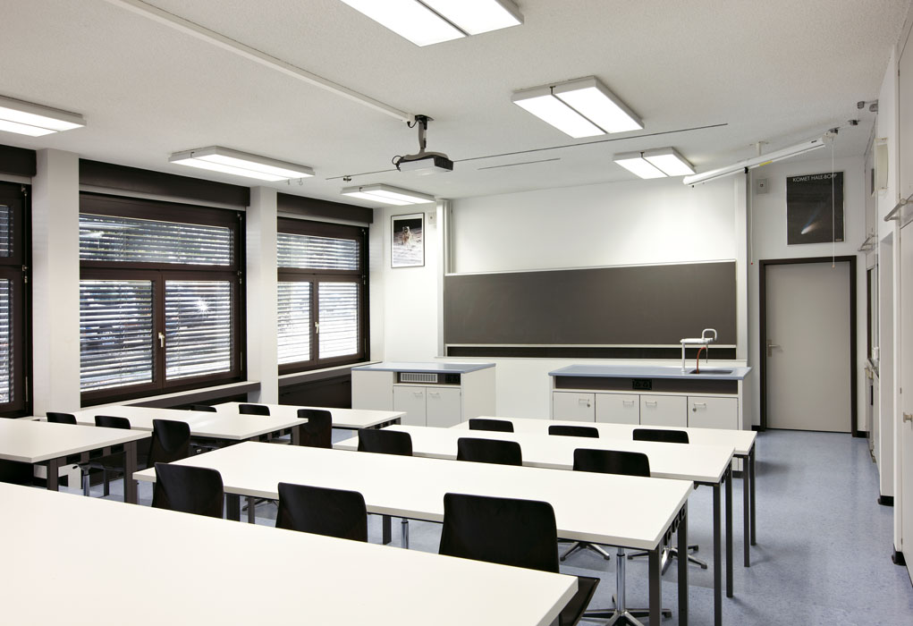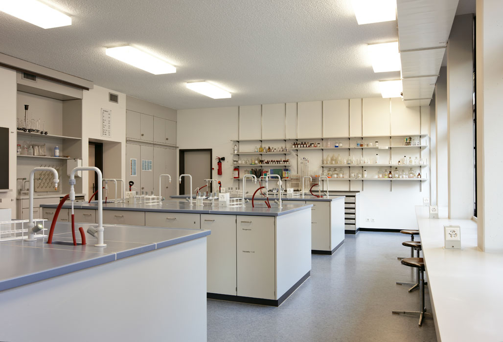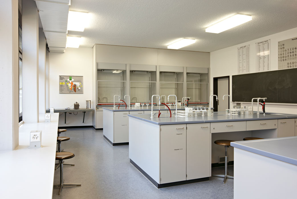 Die Naturwissenschaftlichen Räume wurden den heutigen Bedürfnissen angepasst. Ein einheitliches Material- und Farbkonzept verleiht diesem Fachbereich eine eigene Identität. Da der Schulbetrieb nicht unterbrochen werden konnte, wurde die Sanierung in Etappen während der Sommerferien ausgeführt.