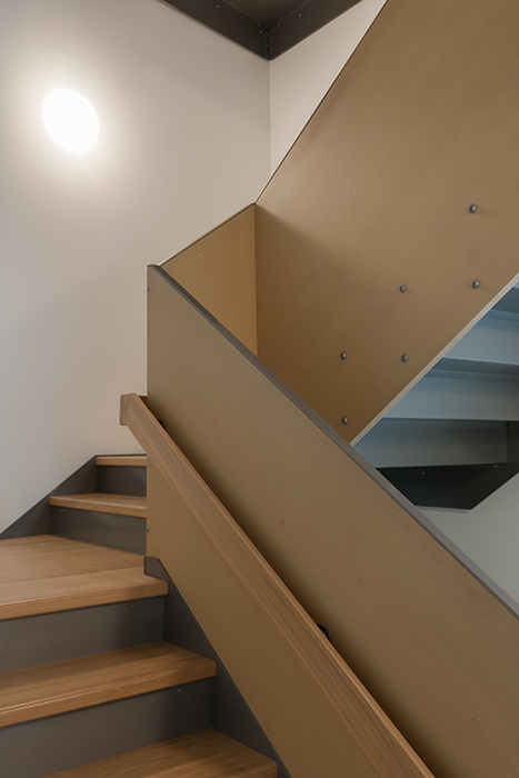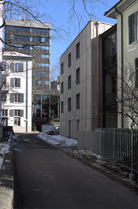 Ein viergeschossiger Holzbau bildet zusammen mit dem bestehenden Gebäude ein kompaktes Ensemble, das einen Rücken zur Erschliessungsstrasse im Hof bildet. Der Anbau schliesst direkt an die bestehende Veranda an. Sie wird zum verbindenden Element der Gebäude. Der Durchgang unter der Veranda bildet den Zugang zum Grundstück und zu den beiden Hauseingängen. Es entstehen klar definierte Aussenräume und der Garten kann optimal genutzt werden.