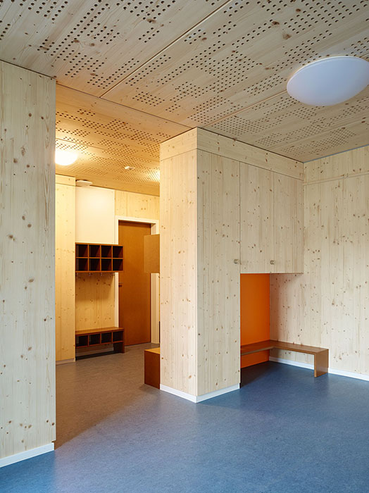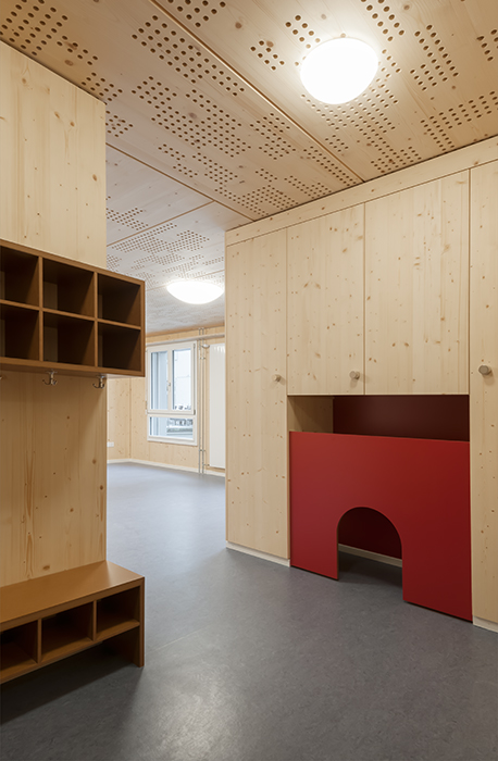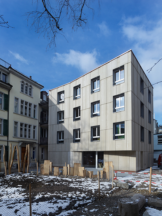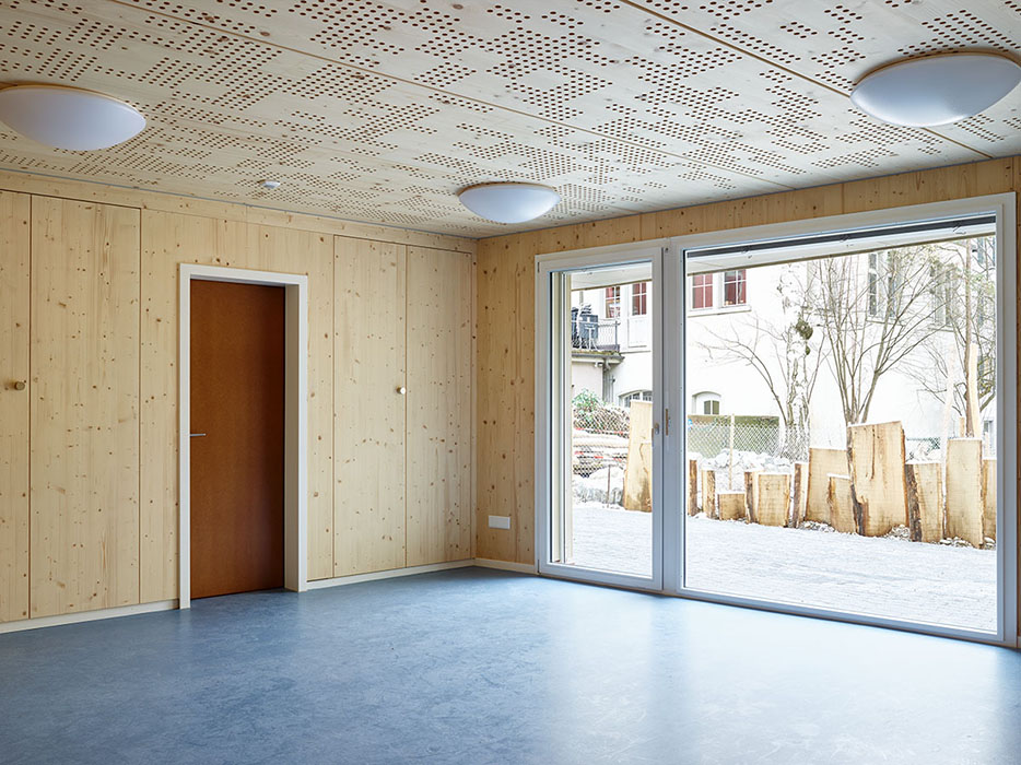 Der Baukörper tritt als schlichter Monolith in Erscheinung. Wegen der Nähe zur Sonneggstrasse 16 mussten die Fassaden nichtbrennbar ausgebildet werden. Die Verkleidung aus Duripanelplatten erfüllt diese Anforderung und nimmt mit seinem mineralischen Charakter Bezug zum bestehenden Gebäude. Die Proportionen der Holzfenster wurden analog zum bestehenden Gebäude ausgebildet. Die Brüstungshöhen sind kindgerecht. Die Fenster sind aussen mit Metallzargen eingefasst. Im Inneren bleibt der Charakter des Holzbaus durch die rohe Holzdeckenuntersicht und die Holzverkleidung des Hauptraumes lesbar.