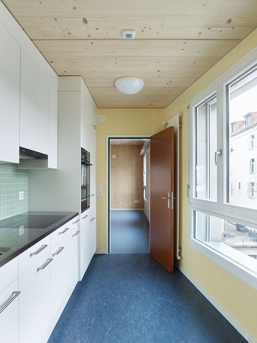In den drei Obergeschossen befindet sich je eine Krippengruppe für ca. 10 – 12 Kinder. Jede Gruppe verfügt über einen zentralen, nach Süden zum Garten ausgerichteten Spielraum mit kranzartig angeordneten peripheren Nutzungen wie Schlafen, Küche, Garderobe und Bad. Zusätzlich ist pro Geschoss ein unabhängiger Raum mit unterschiedlicher Nutzung untergebracht. Das Erdgeschoss dient der allgemeinen Nutzung. Die Anordnung der Vertikalerschliessung ermöglicht eine direkte Verbindung über die bestehende Veranda zu den beiden Obergeschossen des Altbaus.