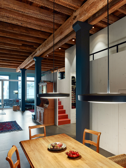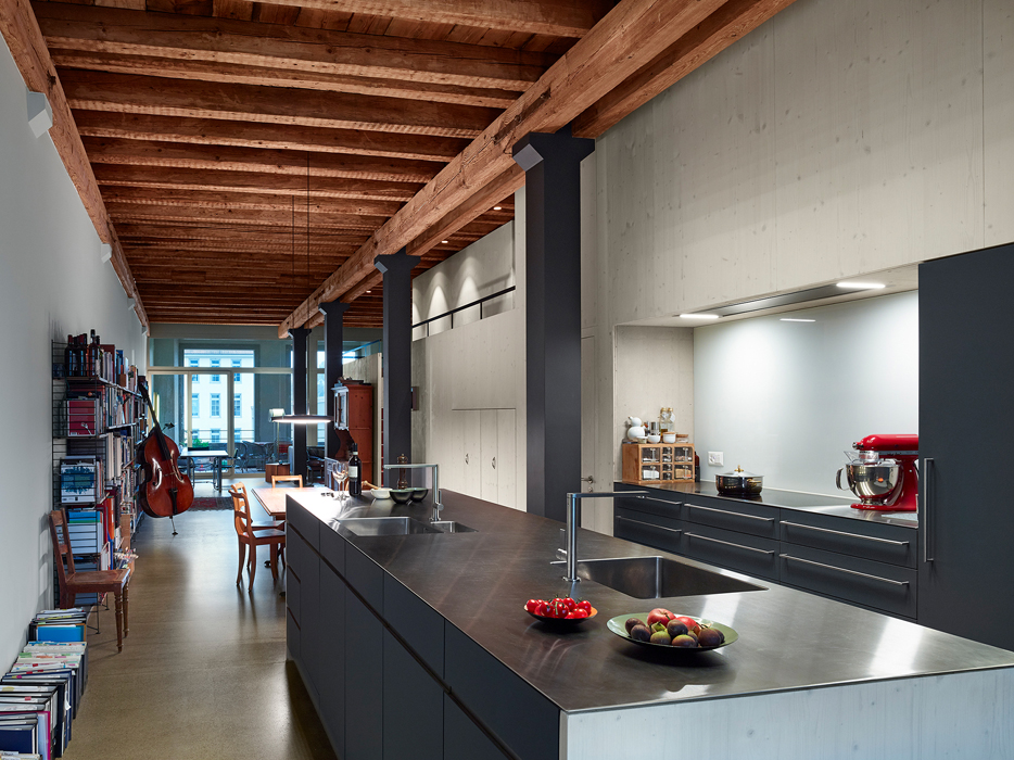 Längs zum Wohn- und Essraum schliesst das Volumen mit einer nutzbaren Raumschicht ab, in der sich Treppen, Schränke und die Küchenkombination befinden. Zwei bestehende, in Querrichtung liegenden Steigzonen konnten geschickt in das Volumen integriert werden.