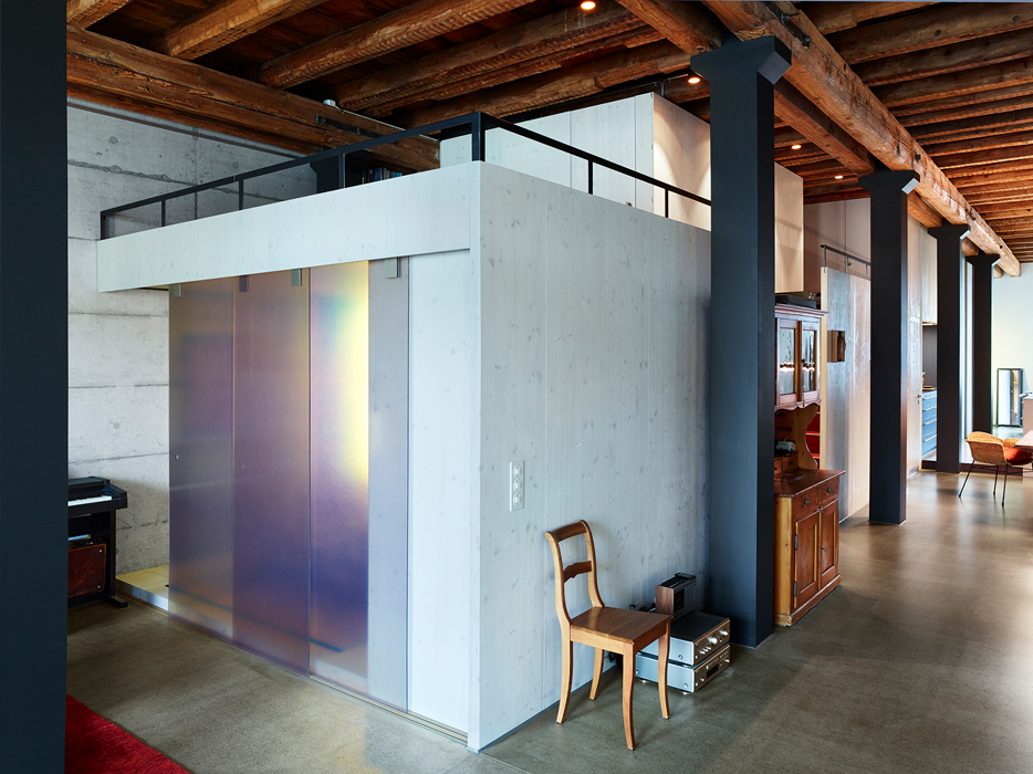 Der grosszügige, 3.60m hohen Raum wurde mit einem „Möbel“ längs unterteilt und zur Hälfte bespielt. Im Möbel wurde Platz eingeplant für den Eingangsbereich mit Garderobe, zwei Schlafräume, ein zusätzliches Gästebett, zwei Nasszellen, Spielbereich für Besucher und Stauräume. Da die Raumhöhe kein vollflächiges Zwischengeschoss zuliess, wurden die Räume nach Gebrauch und Wichtigkeit kategorisiert und ihre Höhen an die entsprechenden Nutzungen angepasst. So springt die Zwischendecke in der Höhe, je nach dem, ob man darauf geht, liegt, sitzt oder nur etwas verstauen will. Unter der Liegefläche des Gästebetts entstand so genügend Raumhöhe für das darunterliegende Gäste-WC. Dank den verschiedenen Niveaus entstehen ineinander verschränkte Geschossschichten, die eine maximale Ausnutzung zulassen.
