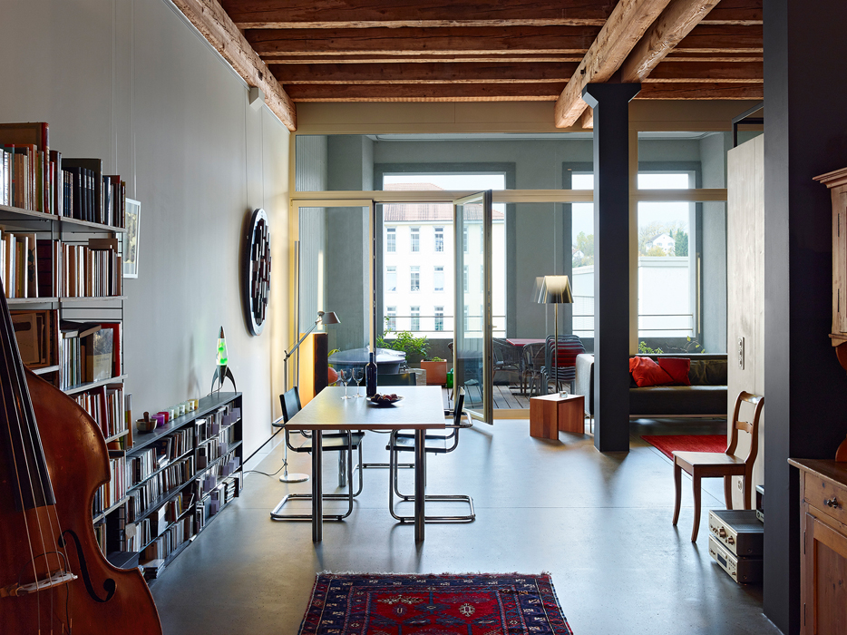 Die Spinnerei III besteht aus gemauerten Aussenwänden und Holzbalkendecken, welche von Stahlstützen getragen werden. Im Auftrag eines Ehepaares wurde eine 158m2 grosse durchgehende Lofteinheit im 2. Obergeschoss ausgebaut.