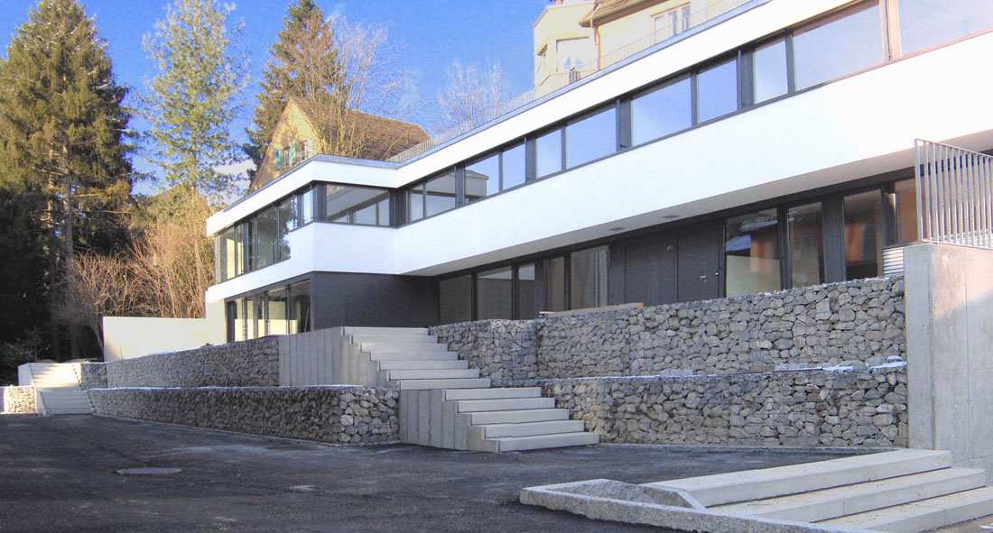 Durch die bestehende Siedlung aus den 30er Jahren zieht sich ein ca. 100m langer und knapp 10m hoher Geländesprung. Das neue Gebäudevolumen von 9 Einfamilienhauseinheiten lehnt sich an die Stützmauer und folgt der Geländekante. Im unteren Bereich der Siedlung entsteht eine grosszügige Platzsituation. Im oberen Teil nimmt das begrünte Dach des Neubaus das Niveau des Geländes auf und schafft dadurch den oberhalb stehenden Gebäuden eine grosszügige Basis. Die Belichtung der etwa 9x9m grossen und aus drei Etagen bestehenden Wohneinheiten erfolgt durch die nach Westen orientierte, grosszügig verglaste Fassade sowie durch Höfe und Oblichter im Stützmauerbereich. Im Eingangsgeschoss sind 18 von den Wohneinheiten unabhängige Parkplätze untergebracht. Das Mittelgeschoss beinhaltet den Schlafbereich. Um den privaten Innenhof im oberen Geschoss sind Wohnzimmer und Küche angeordnet. |